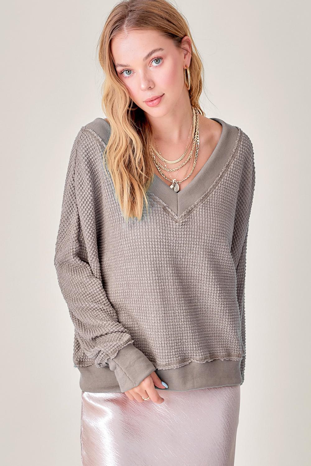 Much-loved Holly waffle top! Cut in an oversized fit featuring a low V neckline, lantern long sleeves with dropped shoulders for a cozy flattering look.
