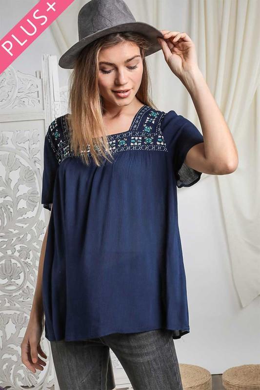 Navy EMBROIDERED SQUARE NECK SWING BLOUSE TOP 100% RAYON
